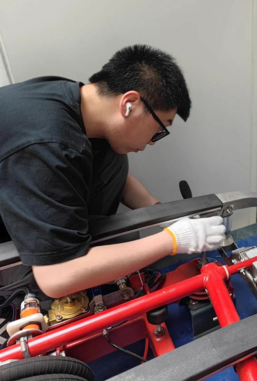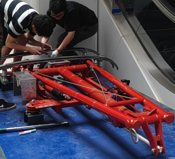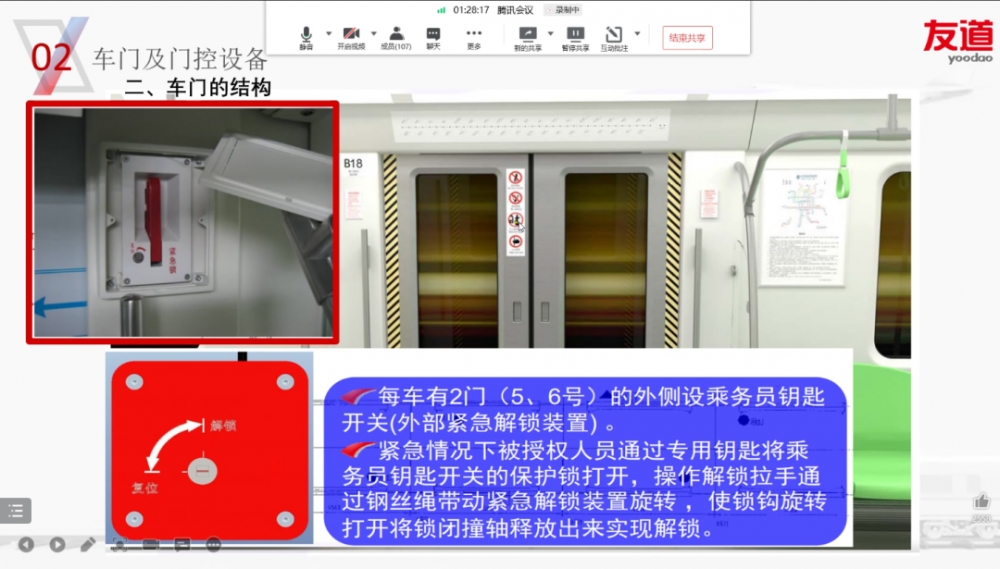 友道科技的軌道交通產品中心技術人員對車門和受電弓進行了現場實操演示,針對受電弓和客室車門的部件維護,向參與培訓的老師實地演示維護內容、維護方法和維護標準。