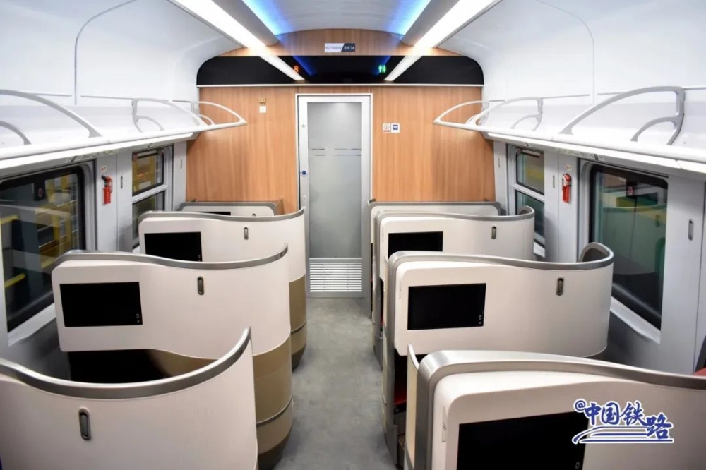 商務區采用CR400AF智能動車組的商務座椅方案,座椅采用大曲面造型設計,配置電動扶手、無線充電、儲物臺、折疊桌板、智能交互終端等。